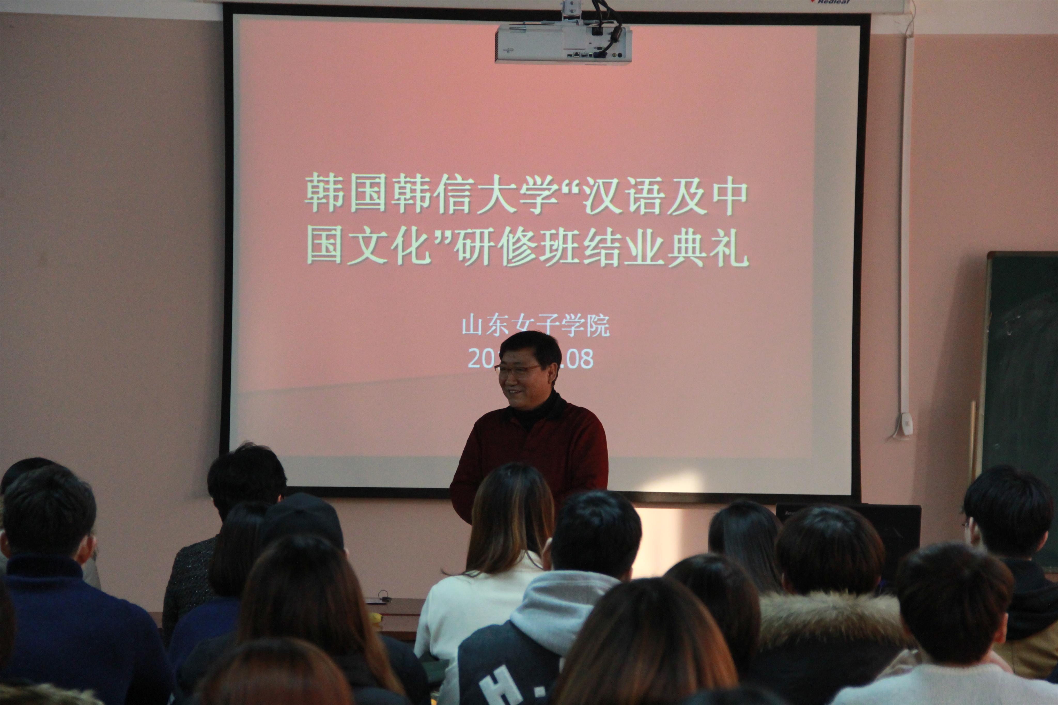 结业典礼上,韩信大学学生代表发言,回顾了在山东女子学院的学习及生活,感谢校方及同学们的付出及关爱。我校韩语学生发言,表达了对韩信大学研修同学的不舍,并表示从韩信大学同学身上学习到了很多,受益匪浅。任课教师、韩信大学国际交流学院院长、我校国际交流处处长分别致辞,希望同学们学有所成,不负重托。之后,我校国际交流处处长为韩信大学研修生颁发结业证书。