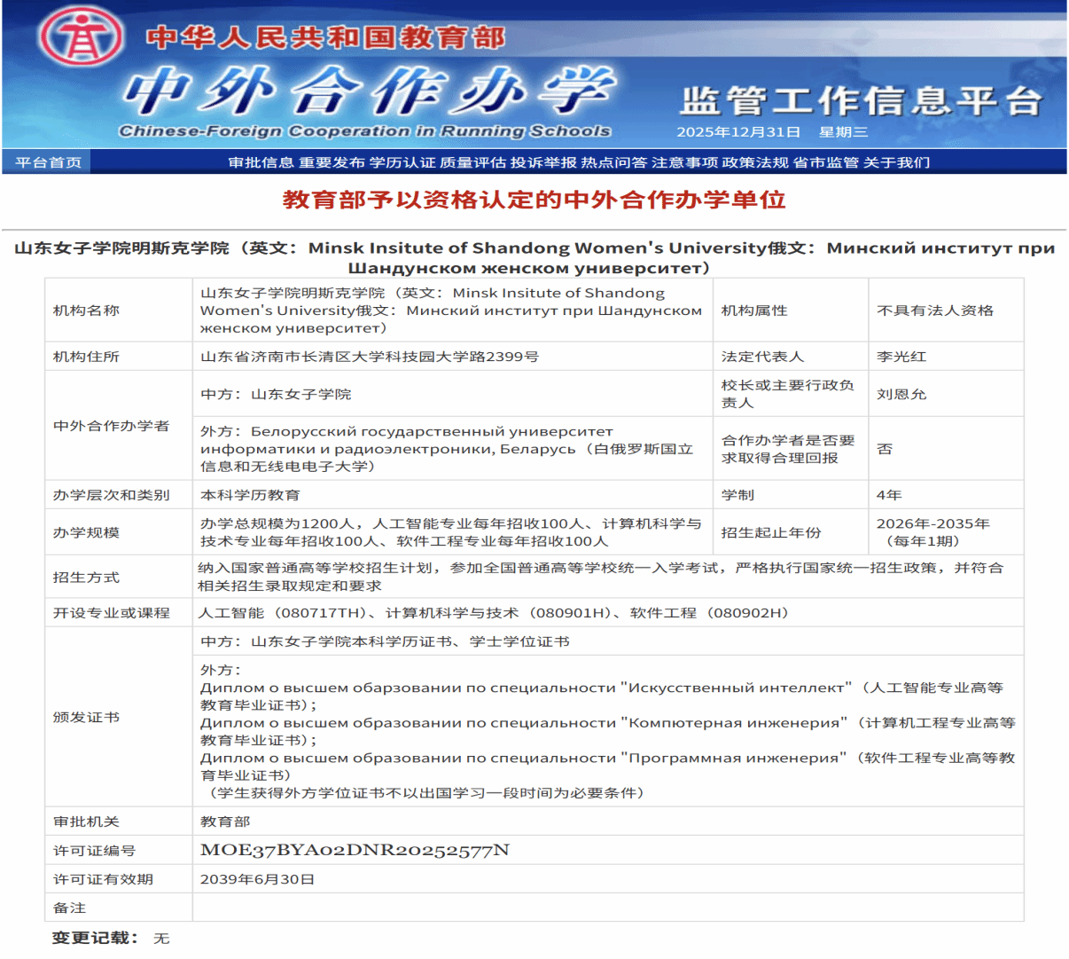 12月31日,我校与白俄罗斯国立信息和无线电电子大学合作举办的非独立法人中外合作办学机构—山东女子学院明斯克学院获教育部批准正式成立(许可证编号:MOE37BYA02DNR20252577N),是山东省首个本科层次的中白合作办学机构,实现了我校在中外合作办学机构上的历史性突破。
